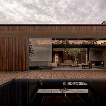 A residência adota um estilo minimalista, com linhas limpas, formas geométricas simples e uma paleta de cores neutra. A arquitetura prioriza o uso de materiais naturais nos acabamentos, como madeira e vidro, que se integram harmoniosamente com o ambiente ao redor e contrastam com a estrutura de aço. O design é caracterizado por sua elegante simplicidade, onde cada detalhe é cuidadosamente pensado para promover uma sensação de serenidade e equilíbrio. Um dos aspectos mais notáveis da residência é sua integração com a paisagem. Grandes paredes de vidro permitem que a luz natural inunde os espaços internos, ao mesmo tempo que oferecem vistas panorâmicas do mar e da vegetação ao redor. As fronteiras entre o interior e o exterior são suavizadas, criando uma continuidade visual que torna a natureza parte integrante do ambiente doméstico. A residência também conta com um pátio interno, que se destaca como ponto focal da casa, através de um jardim com vegetação exuberante.